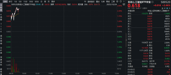 今日(10月24日)科技自主可控方向涨势如虹,重点布局国产AI产业链的科创人工智能ETF(589520)跳空大涨,场内价格盘中涨超2.8%,现涨2.66%。成份股方面,澜起科技领涨超5%,恒玄科技、虹软科技涨逾4%,芯原股份、中科星图、寒武纪等个股跟涨。